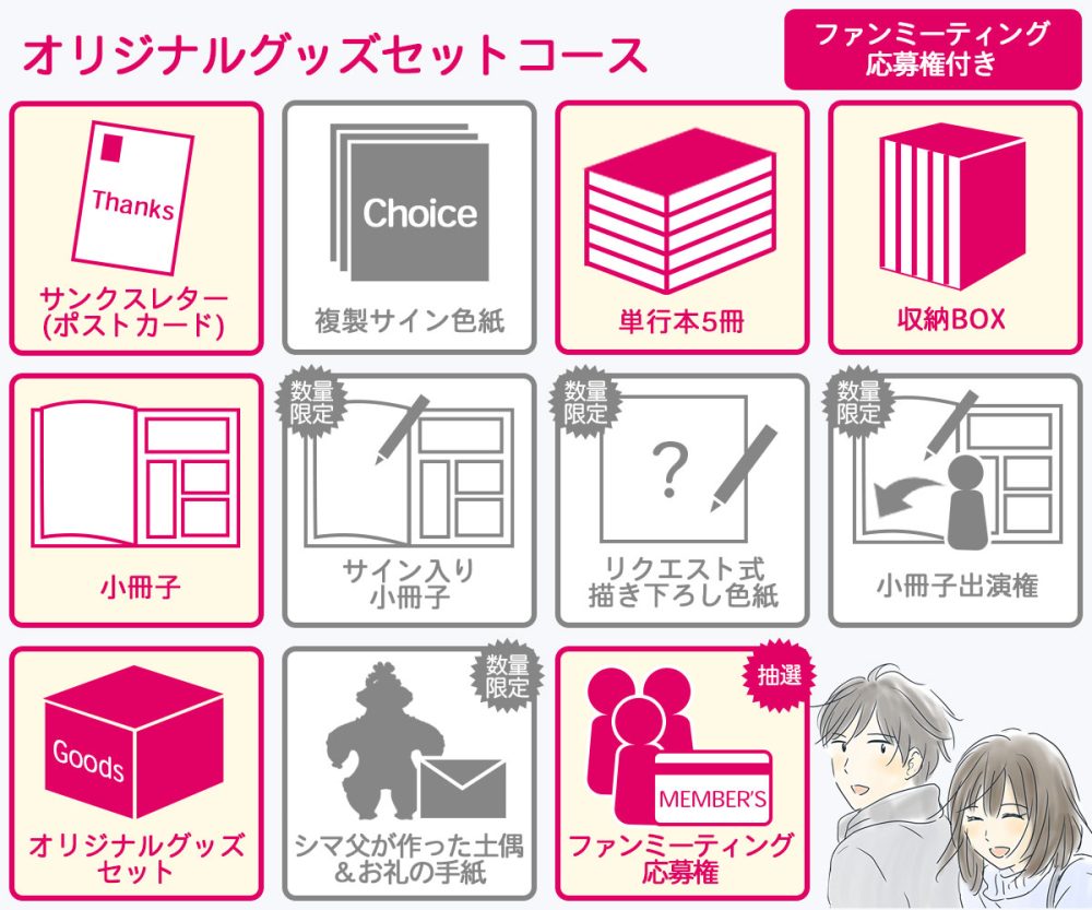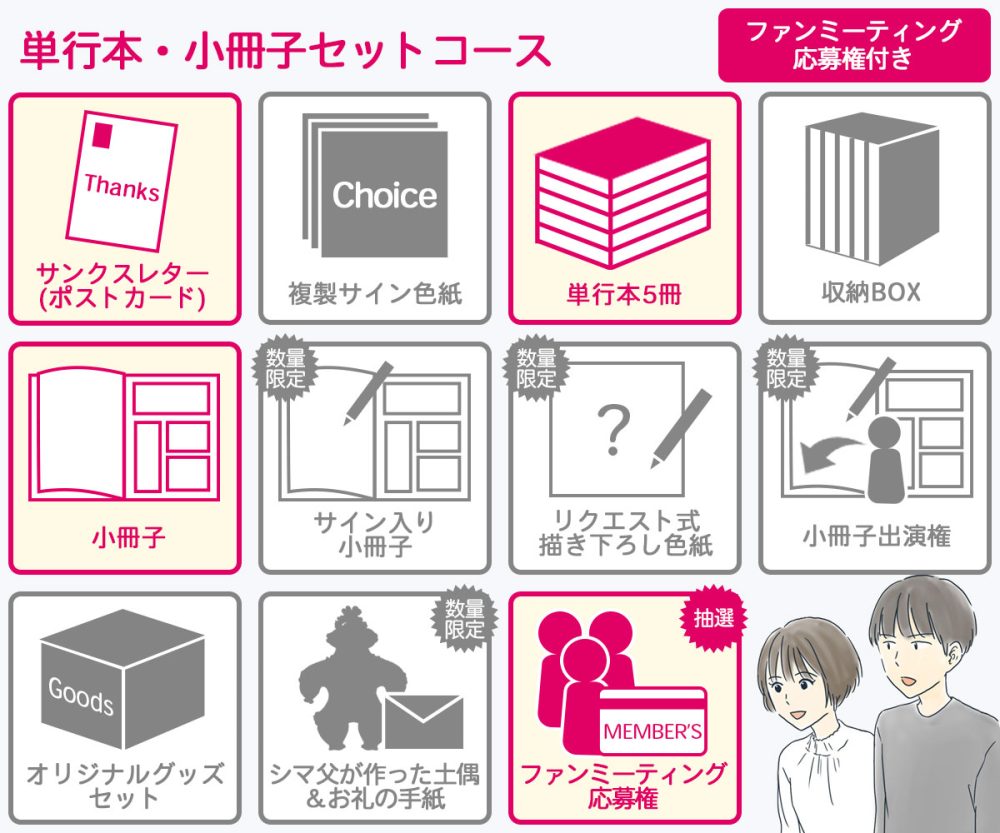 「マンガが全部欲しい!」というかたは「単行本5巻と描きおろし小冊子コース」がおススメ。「マンガとグッズも欲しい!」というかたは「オリジナルグッズコース」がおススメです。単行本もグッズも単品でのご支援もできますが、セットコースの方がお得になっています。