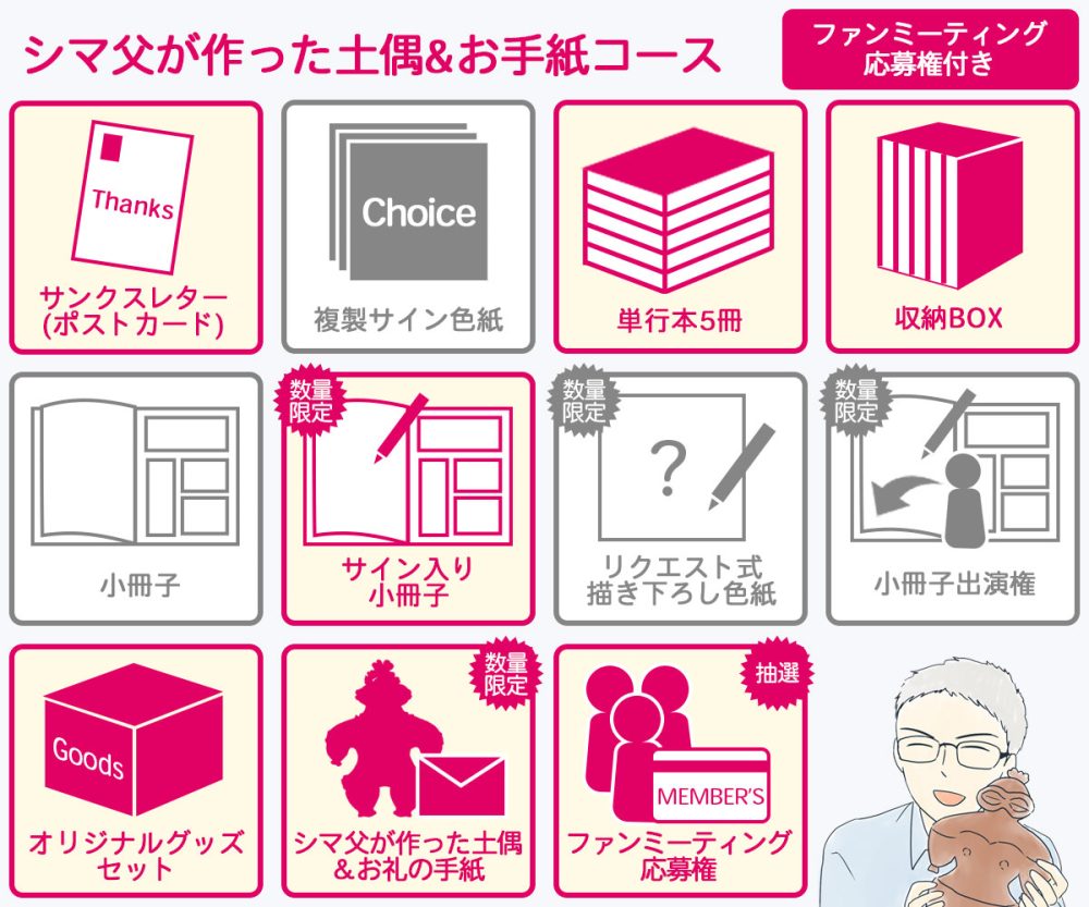 シマ父から当プロジェクトに協力したい!との熱い思いをいただきまして、お手製の土偶を数量限定でご用意。シマ父からのメッセージを添えたお得なコースとなっております。なお、こちらのコースには、遥那先生の直筆サイン入り小冊子の他、単行本5冊と収納BOX、グッズセットのほぼフルセットとなっております。